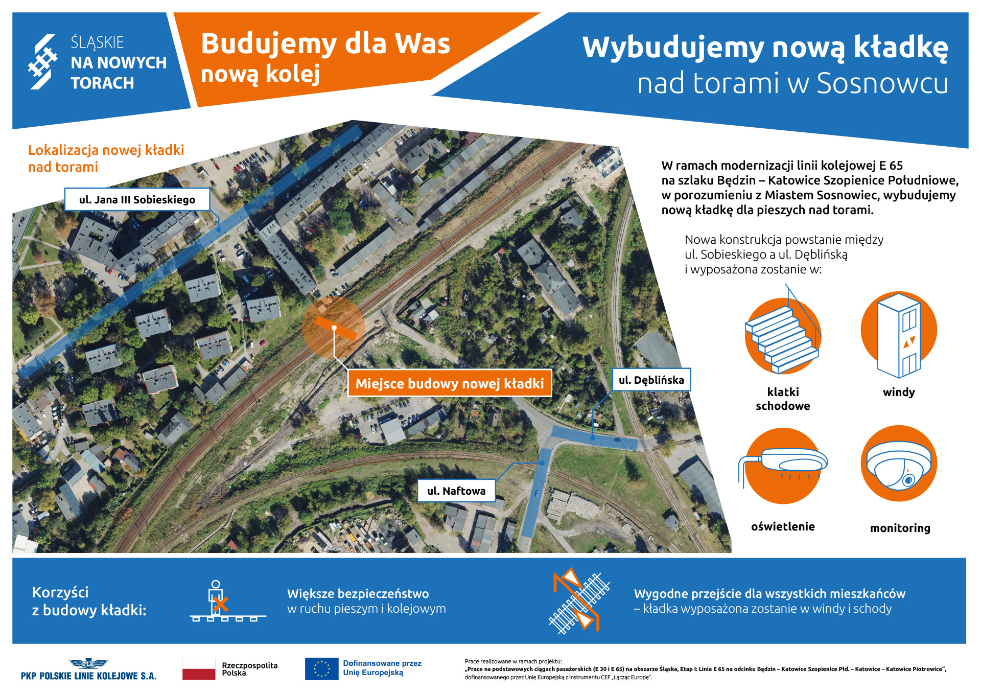 Efektem porozumienia pomiędzy PLK SA i Miastem Sosnowiec będzie bezpieczne przejście dla pieszych przez tory, które połączy ul. Jana III Sobieskiego i Dęblińską. Kładkę wybudujemy w ramach realizowanego zadania na odcinku linii kolejowej Będzin – Katowice Szopienice Płd. Niebawem podróżni skorzystają też z nowego peronu na stacji Sosnowiec Główny.