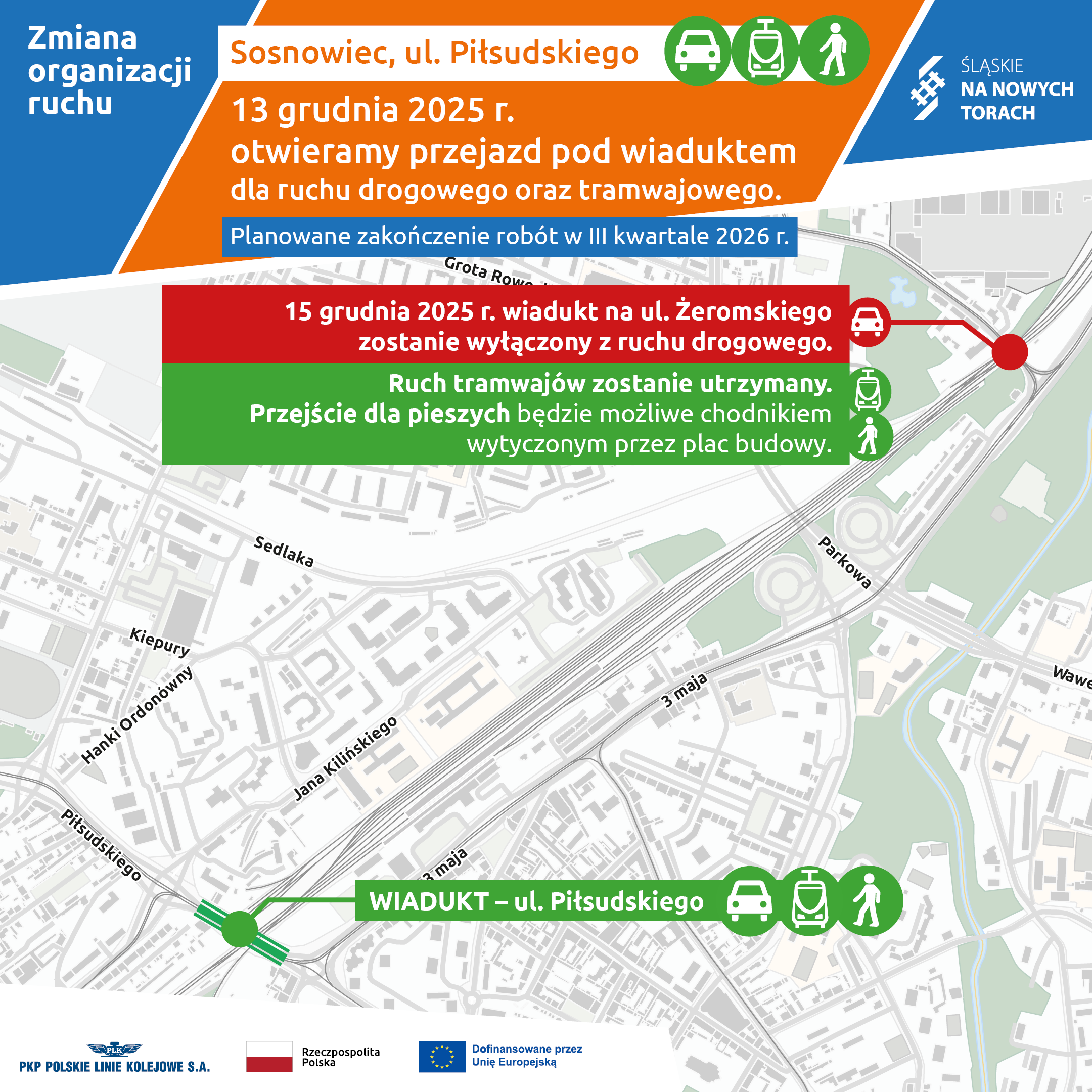 W najbliższą sobotę, 13 grudnia o godz. 6:00, otworzymy ul. Piłsudskiego w Sosnowcu dla ruchu samochodów i tramwajów. Ruch pieszy jest utrzymany przez cały czas prowadzenia inwestycji. Pociągi kursują zgodnie z rozkładem jazdy po nowo wybudowanej, zachodniej części wiaduktu kolejowego.